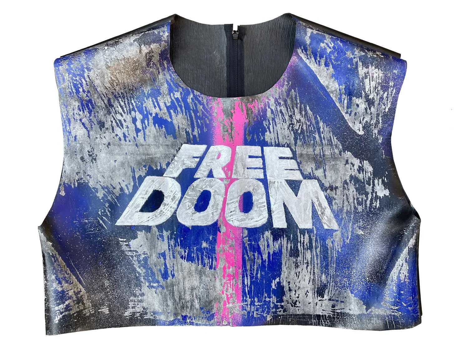 “A hand painted rubber vest sculpture, from an ongoing series of paintings featuring statements inspired by current social, political and environmental issues. ‘Free doom’ was inspired by conversations and some thoughts I had about freedom of speech and freedom of movement.”